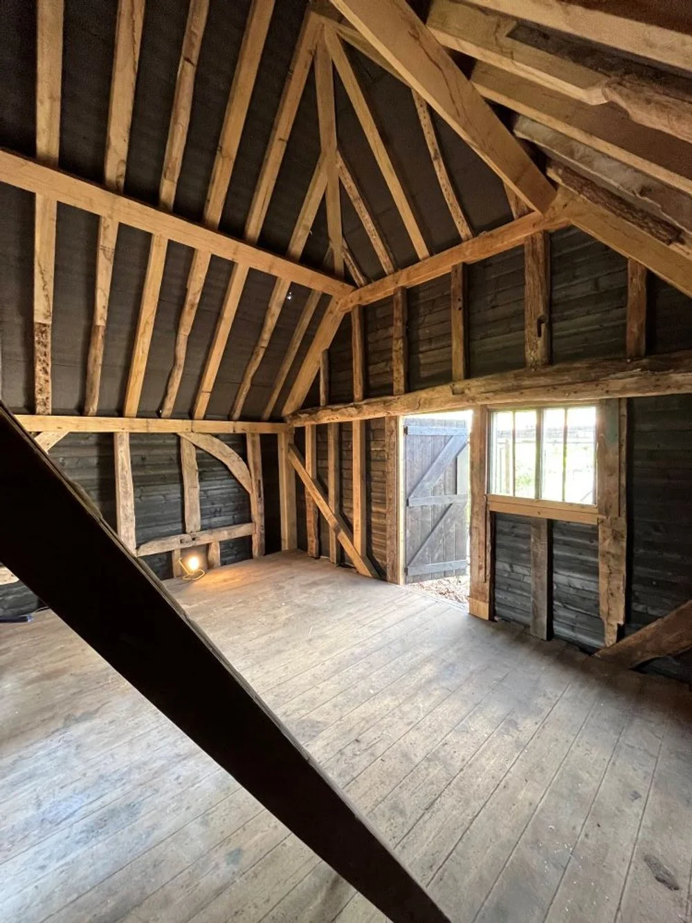 Restoration: Original timbers were retained wherever possible, with new oak spliced in where necessary. Staddle stones were reset, walls and floor structure repaired, and the roof rebuilt to its correct pre-Georgian hip design. Original clay tiles were refitted alongside reclaimed matching tiles.